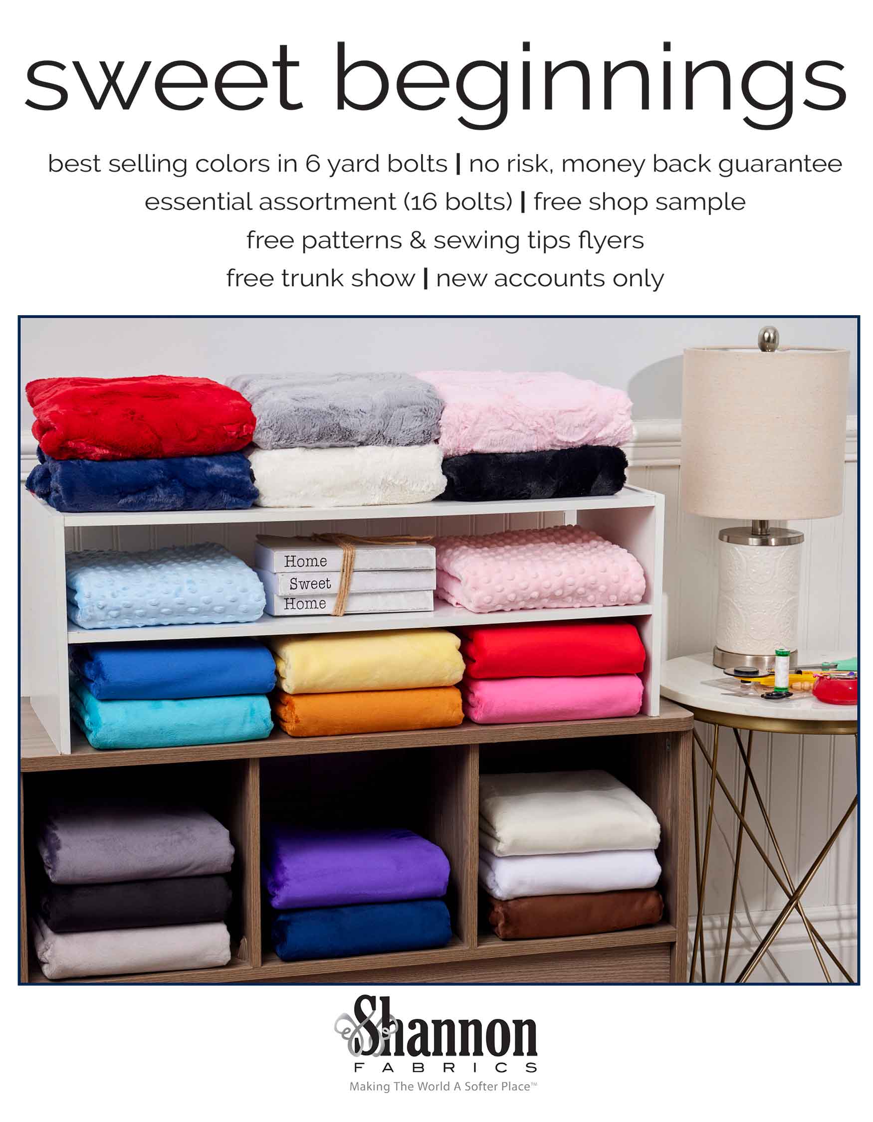 Click one of the images below to learn more, and if you have any questions or are interested in purchasing a package, call us at 866-624-5252 or email us at info@shannonfabrics.com and one of our friendly customer service associates will be in touch.